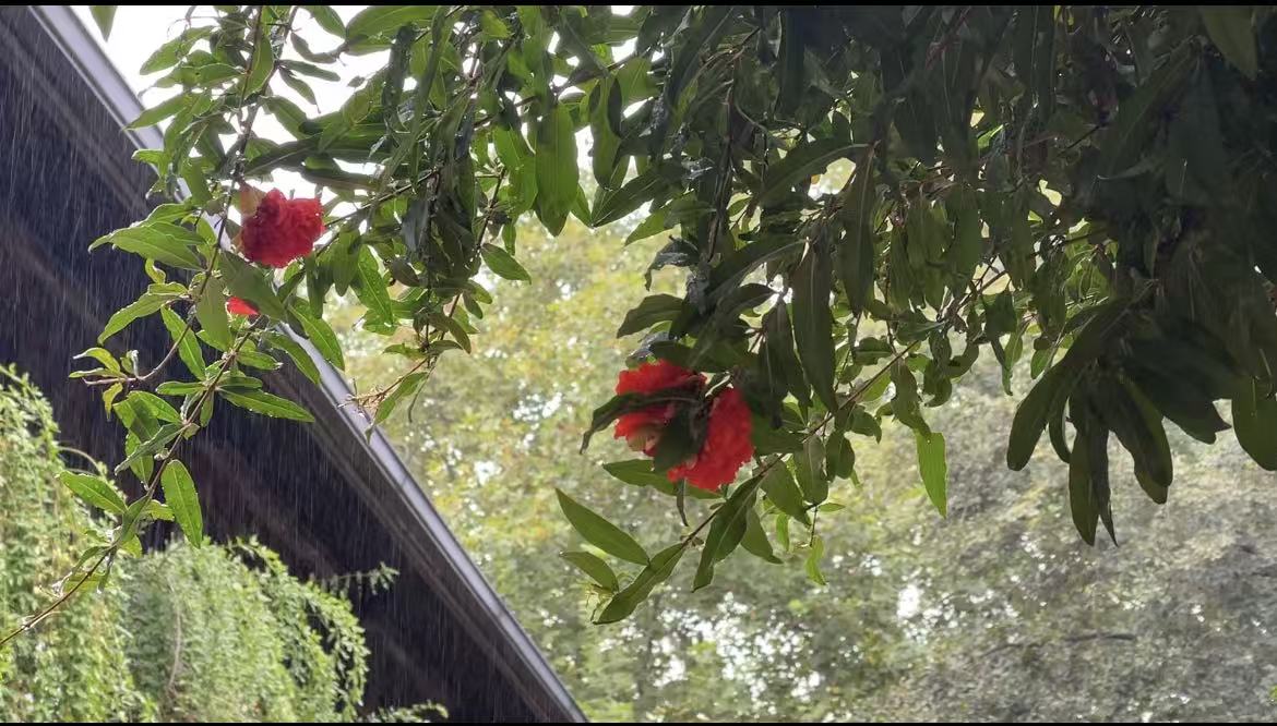 10月18日,南塘老街,雨水中的红花绿叶。记者石承承 摄